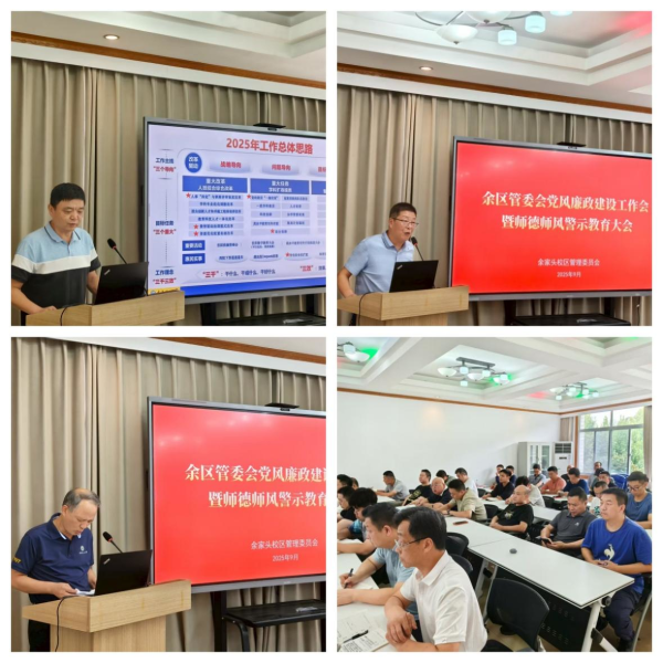 9月18日下午,余区管委会在综合楼423会议室召开了2025年下半年工作布置会、党风廉政建设工作会暨师德师风警示教育大会。余区管委会全体职工党员参加,会议由党委书记李洪彦主持。