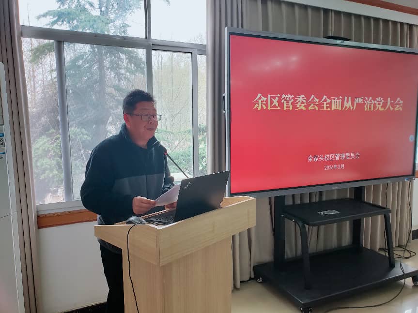 苏文胜主任作大会总结讲话。他强调,2026年是学校“十五五”的开局之年,余区管委会全体党员干部职工要坚决贯彻落实党中央和学校党委关于全面从严治党的新要求新部署,压实压紧管党治党责任,以全面从严治党新成效引领保障余区管委会各项事业高质量发展。