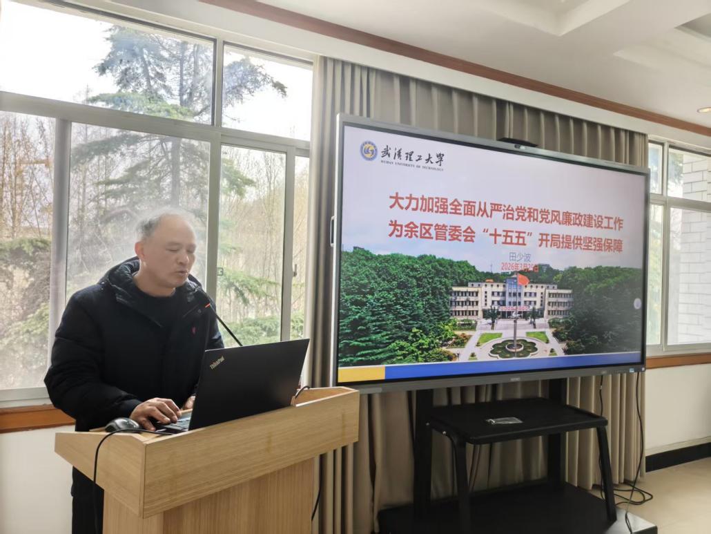 余区管委会副主任、纪委书记田少波传达了校党委副书记、纪委书记李金发在学校2026年全面从严治党大会上的讲话精神,介绍了学校当前党风廉政建设面临的新形势新任务,面向管委会全体职工对学校违规违纪违法典型案例进行了通报,并对余区管委会2026年纪检监察工作和师德师风建设工作进行了部署,要求全体教职工严守廉洁自律和师德师风底线,进一步压实师德师风建设责任。
