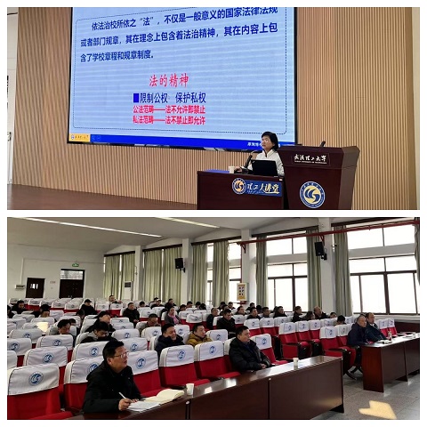 法治教育专题辅导报告由黄莉萍教授主讲,报告以依法治校为主题,围绕什么是依法治校、为什么要依法治校、怎么样依法治校系统阐释了依法治校精神。黄莉萍教授在报告中着重强调,依法治校迫切需要教职工树立法律意识,运用法治思维和法治方法参与学校教学、科研、管理服务工作。黄教授的报告脉络清晰、重点突出、案例生动,带领参学人员深刻领悟了弘扬社会主义法治精神,推进依法治校工作的重要意义。