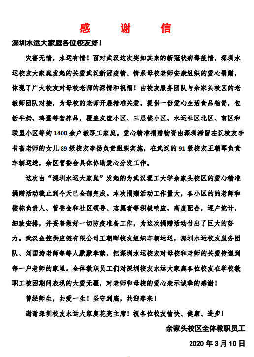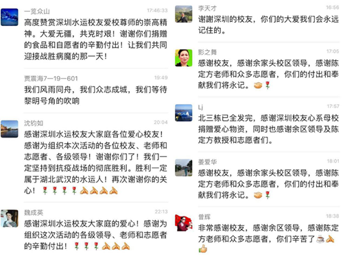 这次捐赠活动,既体现了校友们心系武汉,情牵母校的深厚情谊,也体现了广大志愿者同心协力,不畏艰难的斗争精神。活动在师生校友中反响热烈,点赞、感谢信息络绎不绝。教职工们纷纷在微信群中表达了对深圳校友和志愿者们的感谢,“感谢深圳水运校友大家庭的爱心,感谢组织这次活动的老师和志愿者们的辛勤付出!”“你们的付出和奉献我们将永记。”“曾经师生,共爱一生!坚守到底,共迎春来!”