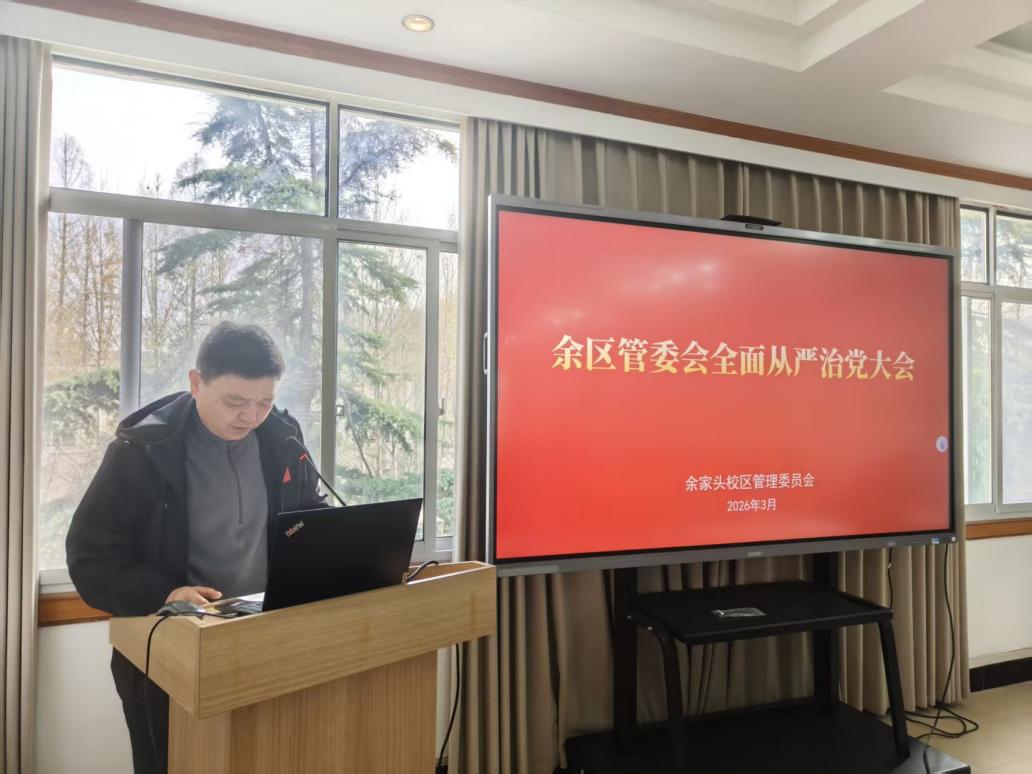 苏文胜主任作大会总结讲话。他强调,2026年是学校“十五五”的开局之年,余区管委会全体党员干部职工要坚决贯彻落实党中央和学校党委关于全面从严治党的新要求新部署,压实压紧管党治党责任,以全面从严治党新成效引领保障余区管委会各项事业高质量发展。